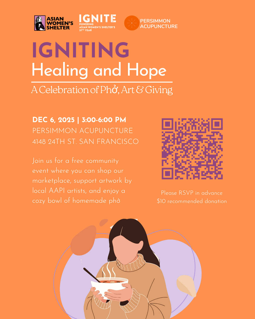 We’re so grateful for our community partners and thrilled to share this extra-special, belated IGNITE event—bringing warmth, creativity, and hope into the holiday season. SFAWS and Persimmon Acupuncture are teaming up to host a cozy, joy-filled Holiday IGNITE Pho-ndraiser, featuring comforting phở, festive treats, and heartwarming community connection.